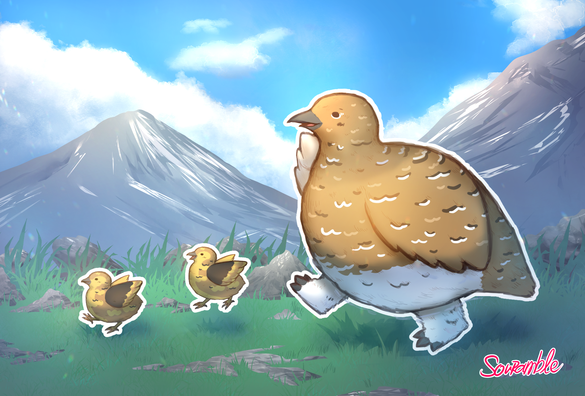 8月は7月に生まれたひなライチョウがどんどん大きくなり活発に歩きまわりはじめる月とのことで、元気なひなライチョウとそれを見守るママライチョウのイラストを描きました。