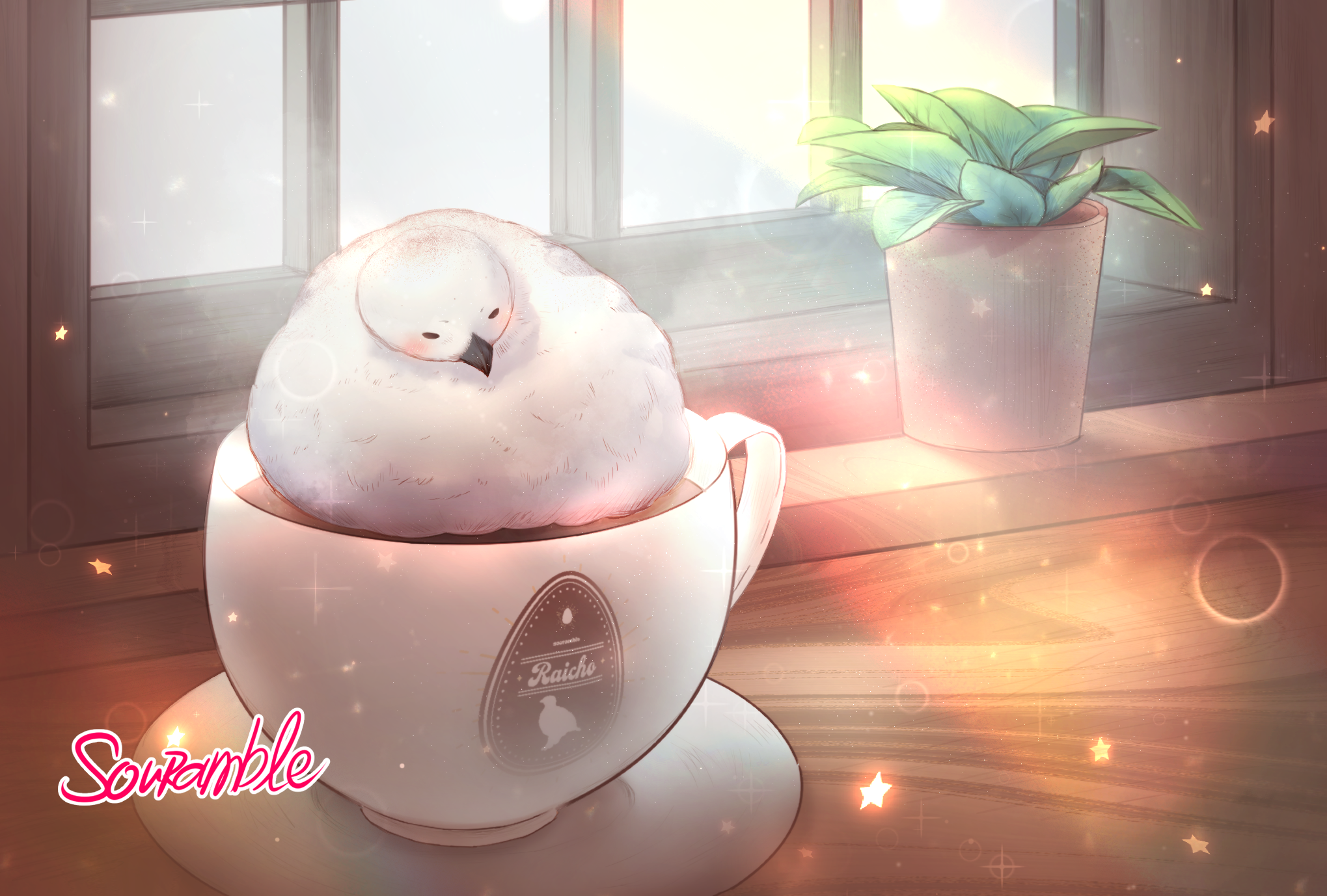 白くてふわふわなライチョウがカプチーノを真似ながらカフェでお昼寝しているイラストです。